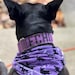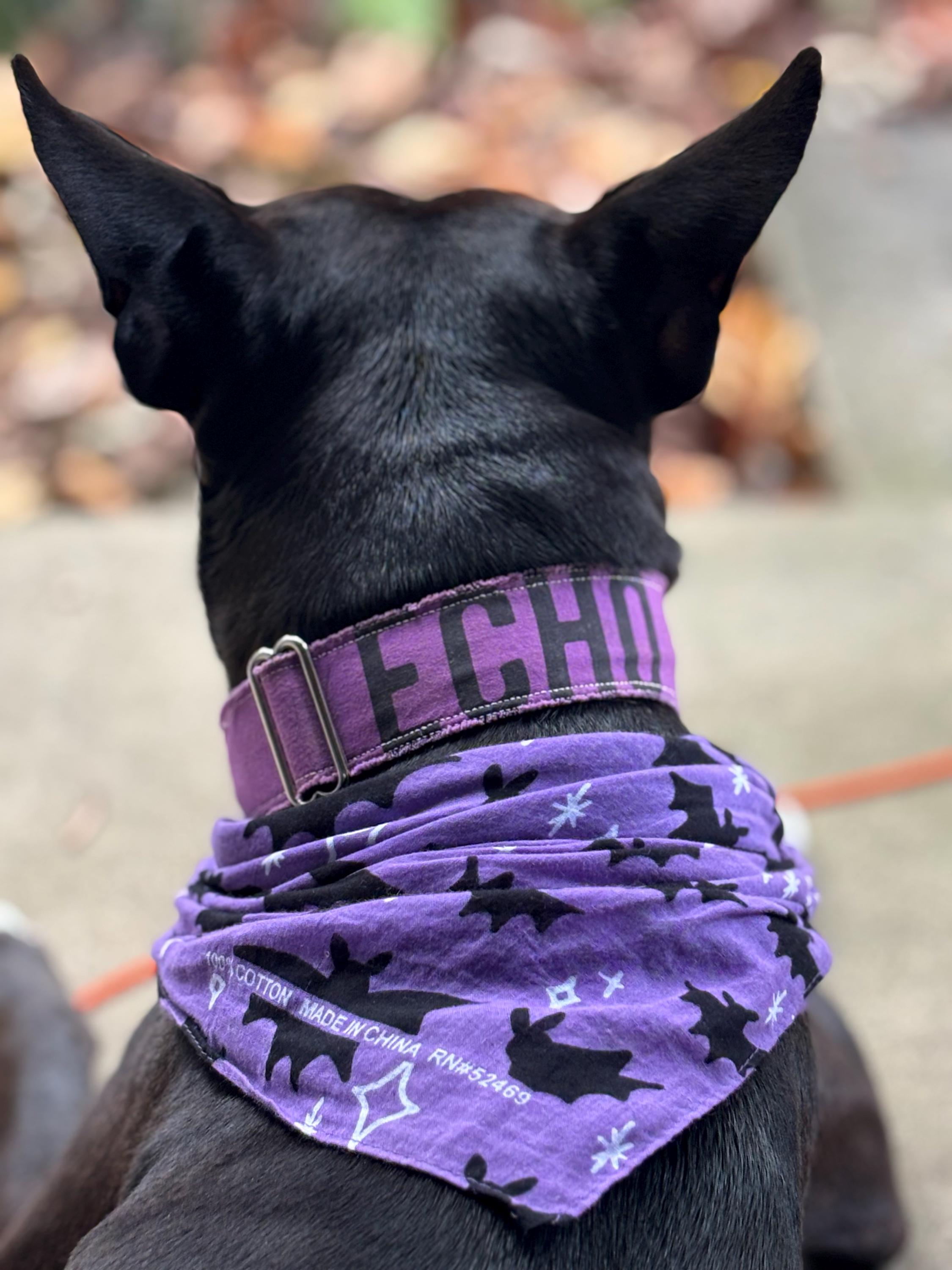 This fun spooky dog collar is for the edgy pups! It features a neon skull and bones pattern and your choice of black or purple for the custom printed panel. It is sewn atop heavy duty webbing for added support. It is available in a 1 1/2” wide martingale. One of my favorite elements of this collar is the raw edge that gives it a more laid back feel. The raw edge will shed slightly for a couple weeks until it is broken in, you can simply pull out or trim the loose threads.