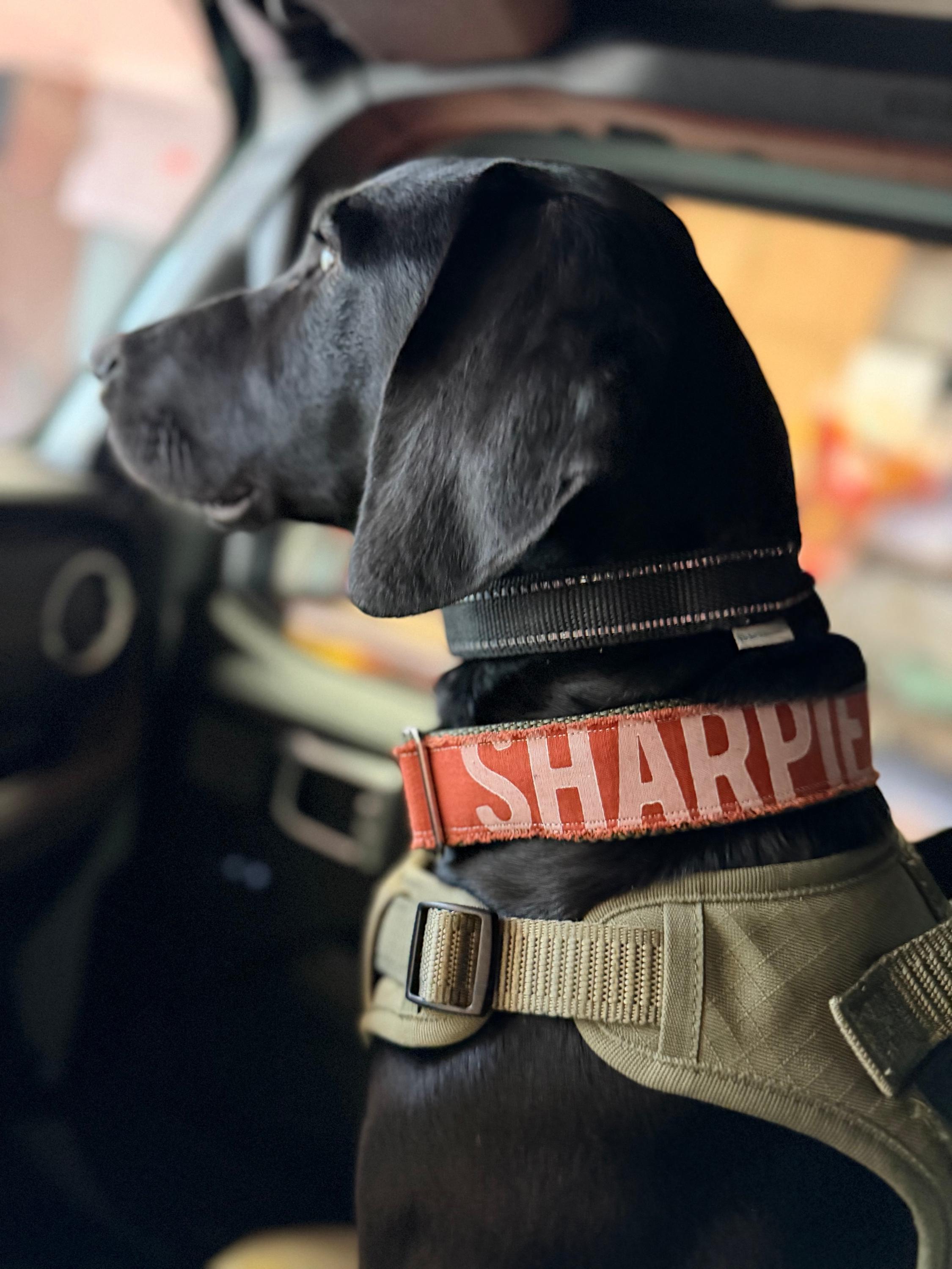 This bright collar is for the playful pups! It features a red, blue, and yellow combo that reminds me of an early 90's toybox. It's hand printed with your dog's name and sewn atop heavy duty webbing for added support. It is available in 1 1/2” wide -both Martingale and buckle styles (without the yellow loop) or in the 1" width-buckle only. One of my favorite elements of this collar is the raw edge that gives it a more handmade/laid back feel. The raw edge will shed slightly for a couple weeks until it is broken in, you can simply pull out or trim the loose threads.
