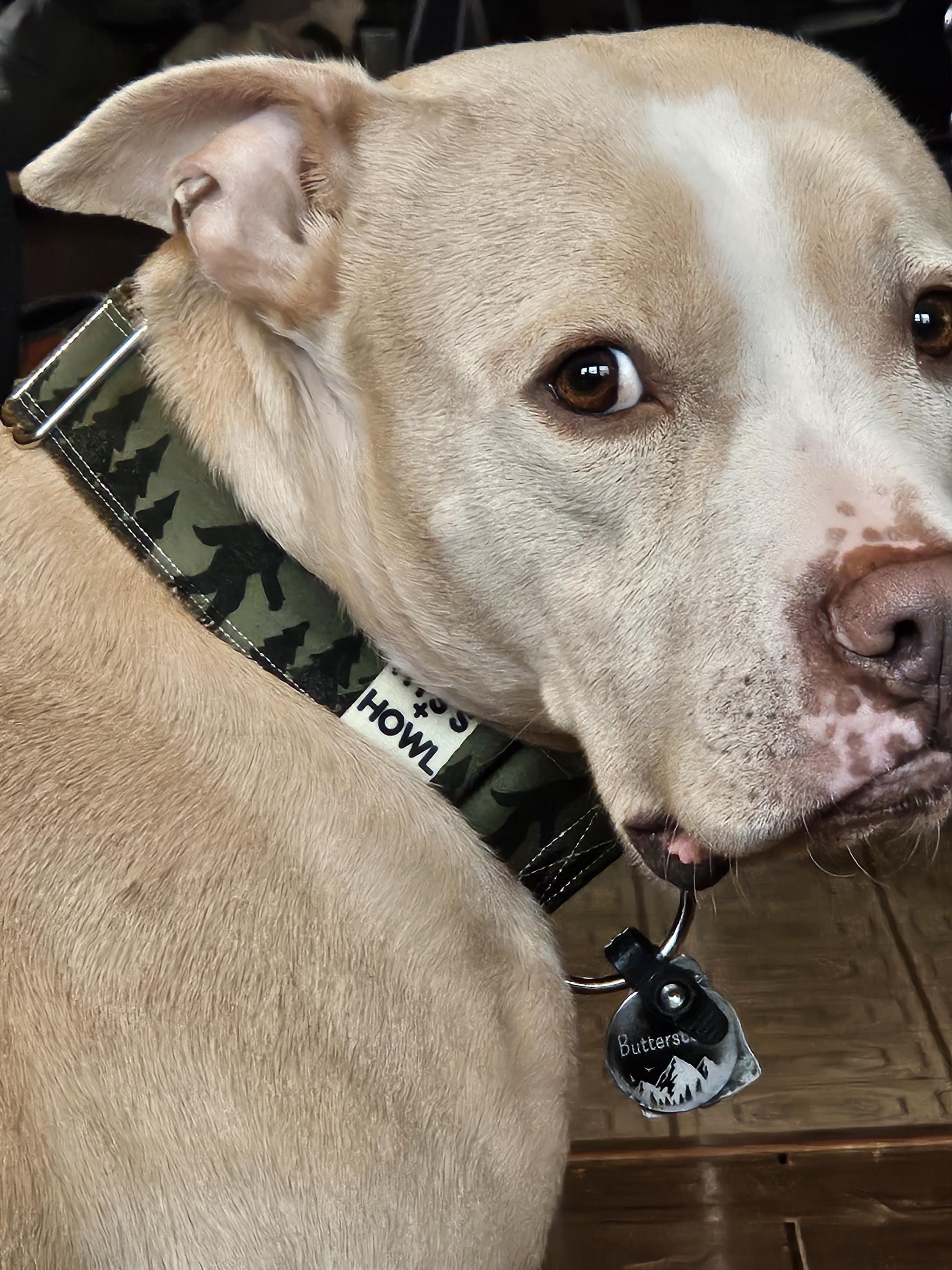 This Bigfoot collar is perfect for the cryptid loving canines! It has a fun Sasquatch forest pattern printed all around and then it is sewn atop heavy duty webbing for added support. It is available in a 1 1/2” width (buckle or martingale) or a 1" width (buckle only, please note that the webbing for the 1" width is beige). One of my favorite elements of this collar is the raw edge that gives it a more handmade/laid back feel. The raw edge will shed slightly for a couple weeks until it is broken in, you can simply pull out or trim the loose threads.