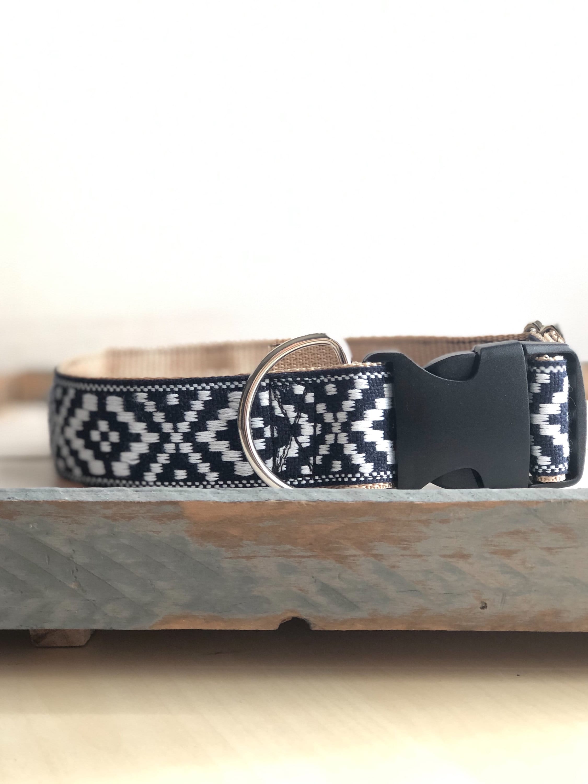 This handmade collar features a fun black and white pattern sewn atop heavy duty webbing for added support. It is 1.5” wide and is available in Martingale or buckle styles.