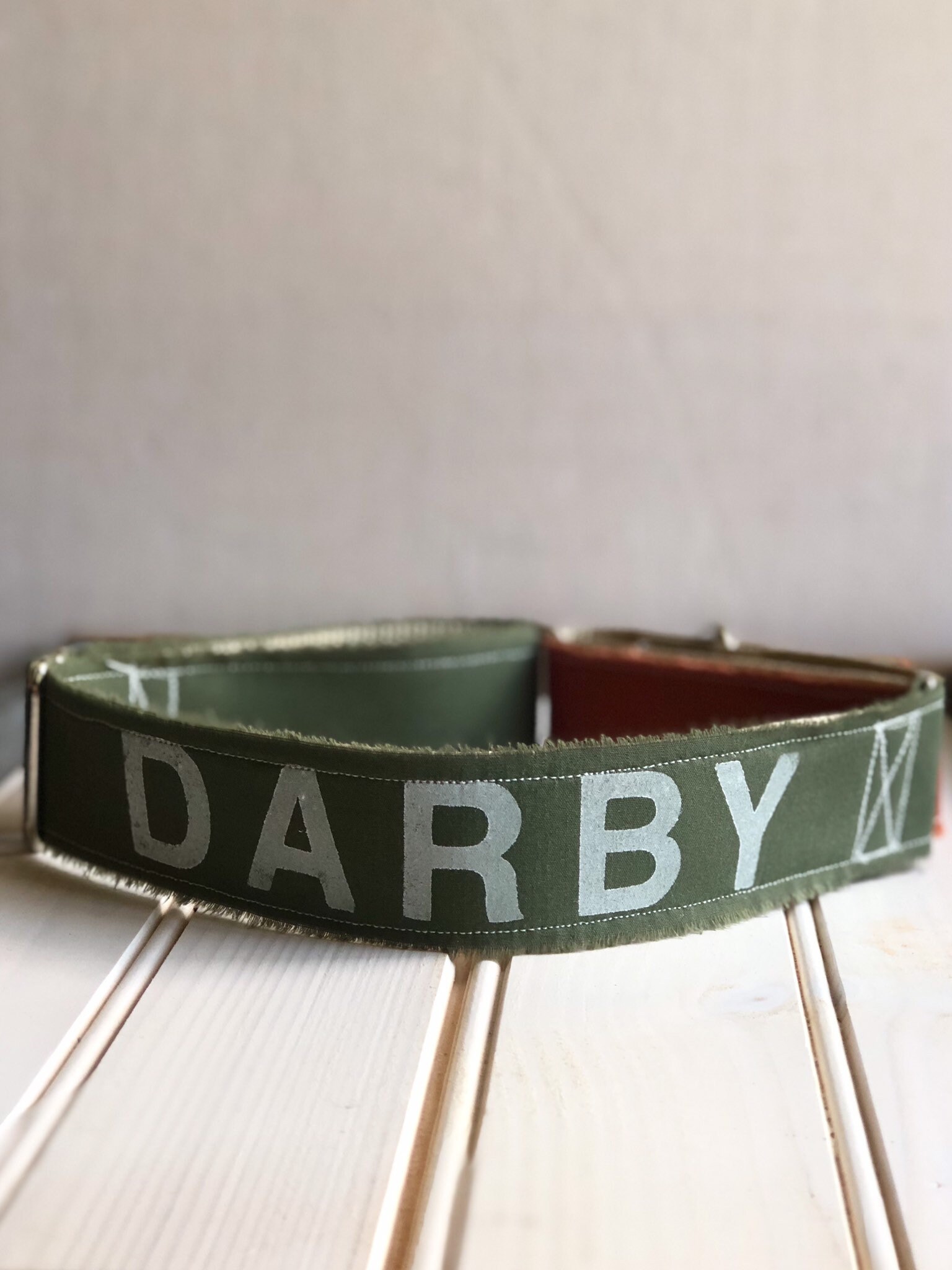 This features a wonderful army green color, hand printed with your dog's name, and sewn atop heavy duty webbing for added support. It is 1 1/2” wide and is available in both Martingale and buckle styles. One of my favorite elements of this collar is the raw edge that gives it a more handmade/laid back feel. The raw edge will shed slightly for a couple weeks until it is broken in, you can simply pull out or trim the loose threads. If you prefer a finished edge just leave a message in the order notes!