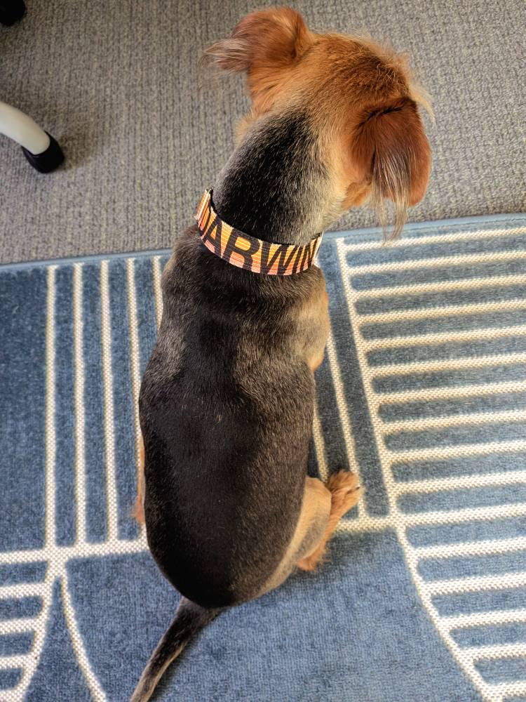 This fun ombre collar is for the playful adventure doggos! It features an orange gradient print sewn atop heavy duty webbing for added support. Please note that because of the material this gradient may vary in shade. If you prefer for the gradient to be darker or lighter feel free to leave a message in the order notes. In 1 1/2” wide it is available in both Martingale and buckle styles and the 1" width is available in buckle only. One of my favorite elements of this collar is the raw edge that gives it a more laid back feel. The raw edge will shed slightly for a couple weeks until it is broken in, you can simply pull out or trim the loose threads.